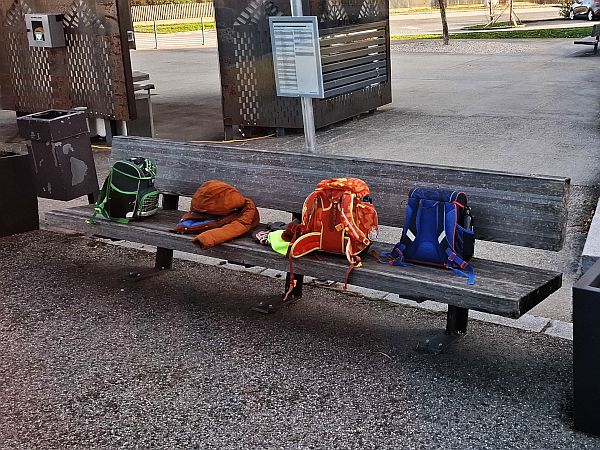 Haltestelle zu einigen verlassenen Schultaschen die